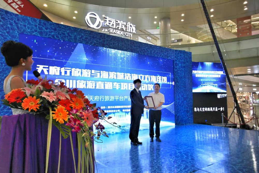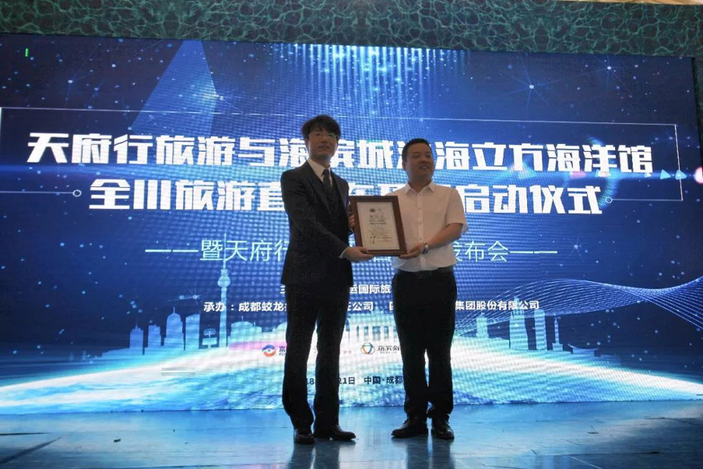 2018年4月21日上午,成都海滨城浩海立方海洋馆与天府行旅游合作开通旅游直通车项目启动仪式在成都海滨城2号中庭举办,香港蛟龙集团CEO黄玉蛟先生、浩海立方海洋馆总经理杨博与四川长运国际旅行社总经理何俊及各方媒体代表出席。
