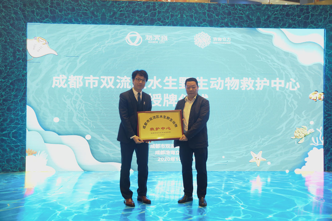 在活动最后,成都市双流区农业农村局党组成员、副局长杨明德先生为浩海立方海洋馆颁发“成都市双流区水生野生动物救护中心”牌匾,这标志着成都市双流区第一家以救护水生野生动物为主的救护中心正式成立,浩海立方海洋馆今后愿与社会各界一起做好保护野生动物、救助野生动物的相关工作。