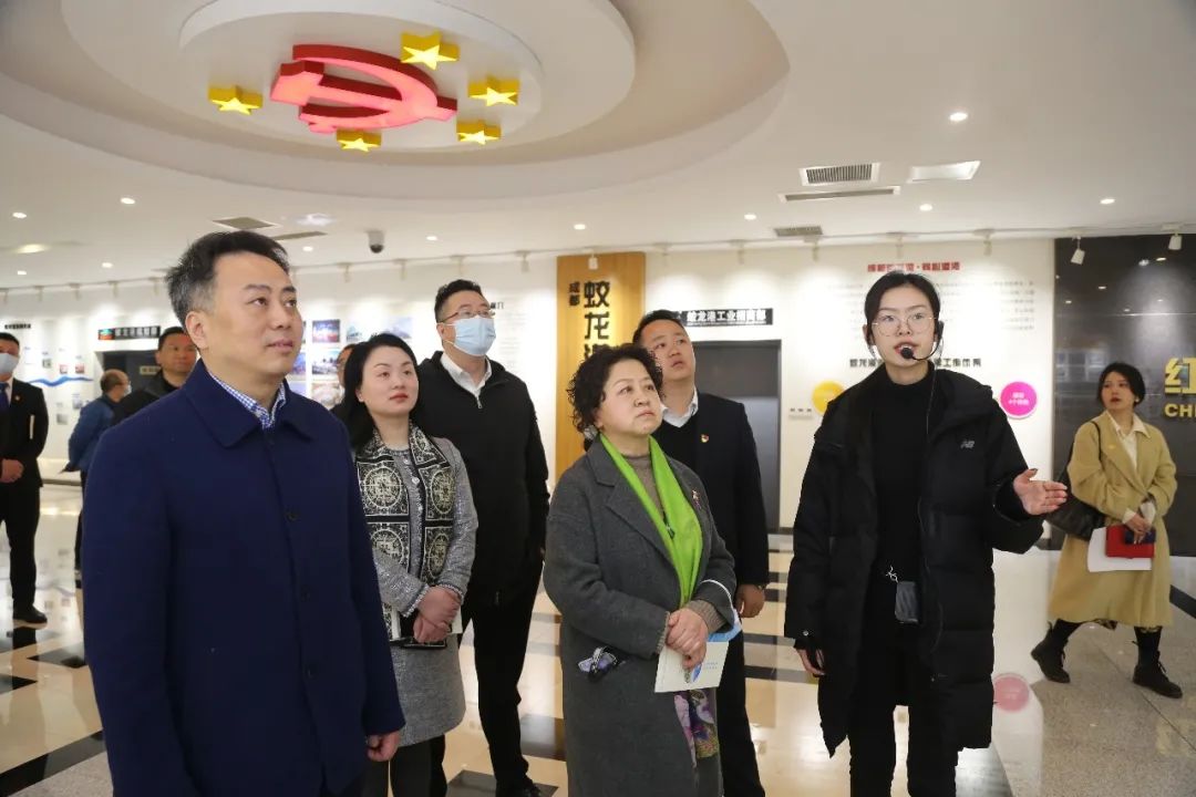考察团参观非公经济党建、统战工作示范区时,了解到成都蛟龙港园区2009年成立党委,下设5个党支部,坚持“以党建带统战,以统战促党建”的原则,以“红色引领、同心港湾”为主题,按照“党建引领、统战聚力、共建共享、服务发展”的工作思路,以成都蛟龙港园区建设为载体,打造了非公经济党建、统战工作示范区。