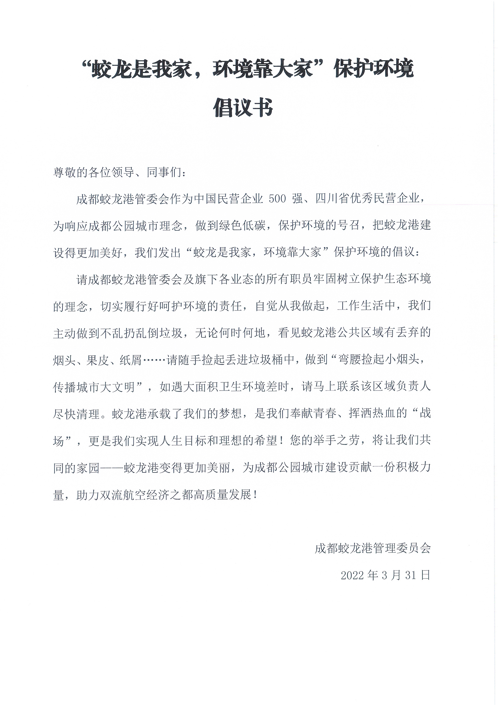 “蛟龙是我家,环境靠大家”保护环境倡议书