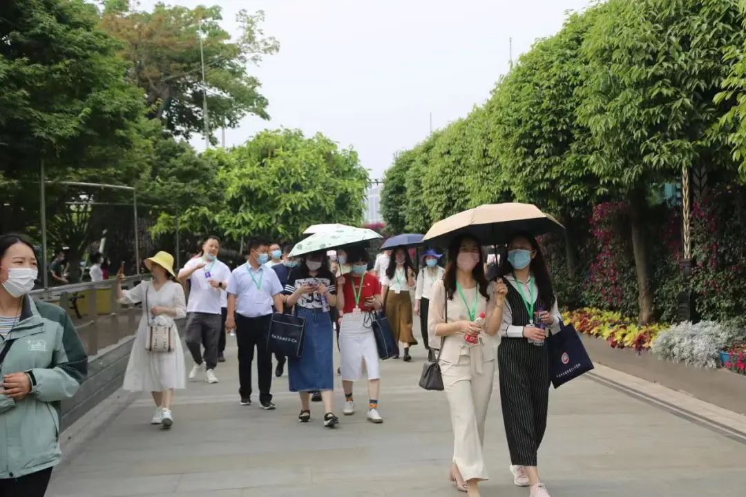 其中,学员们参观成都·海滨城景区天空渌道碳中和项目,了解到成都蛟龙港为推动双碳事业,助力成都公园城市建设,充分运用现代化科技手段,利用已有城市空间,节约土地资源,建设碳中和项目天空渌道,引进珍稀树种 100 余种,实现植树造林面积约 30 亩,让游客感受“立体式的园林文化”,举目亦能享受到天际线靓丽的风景,置身于绿植的天堂,目前项目已获批专利 13 项。