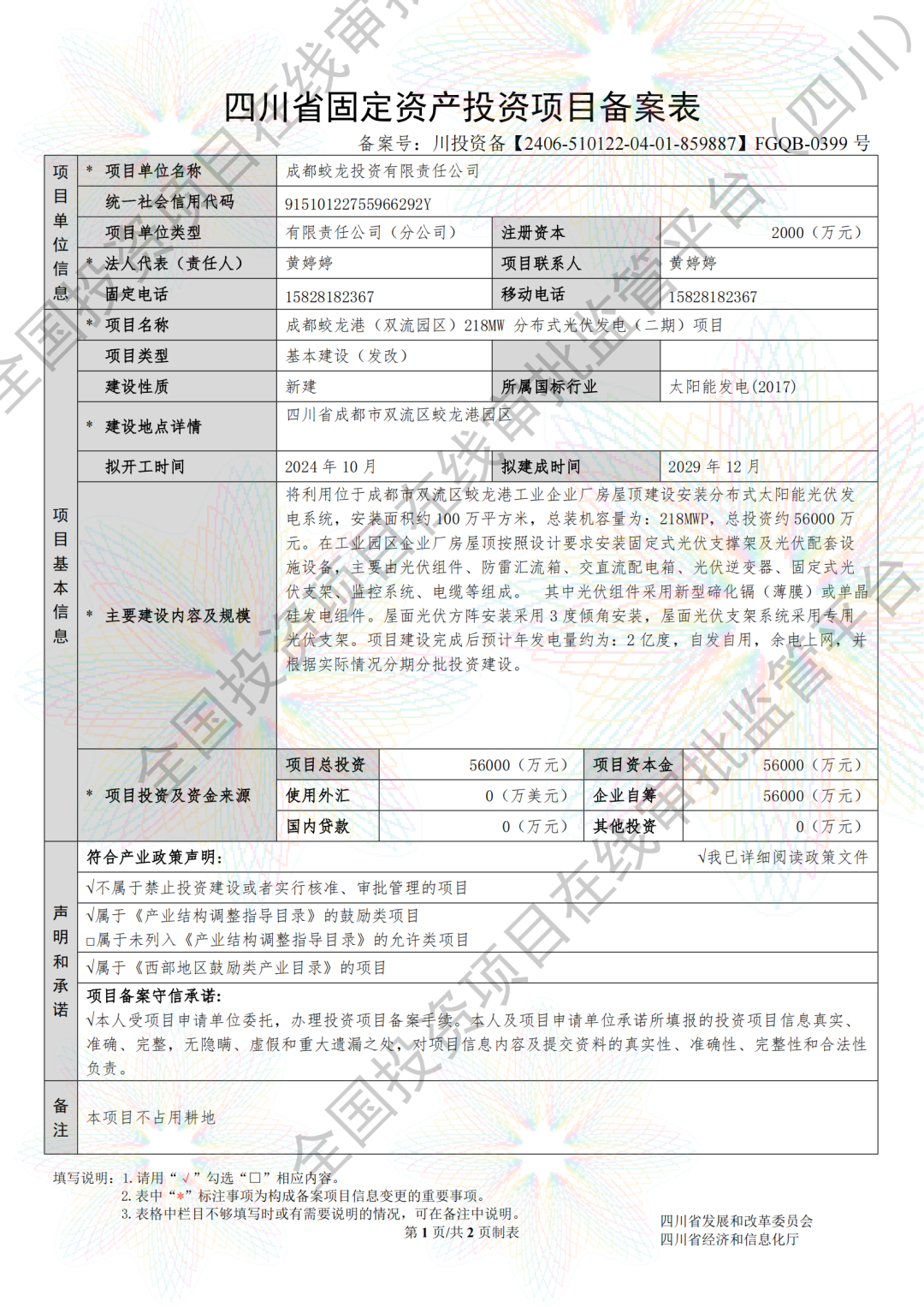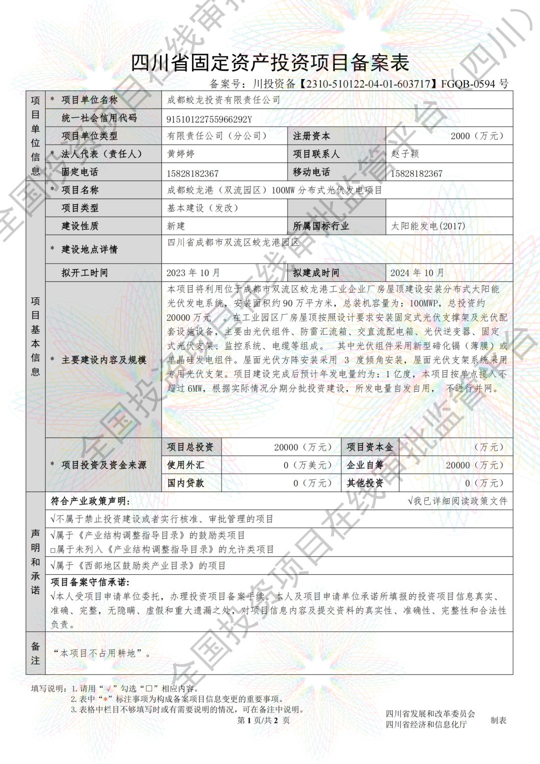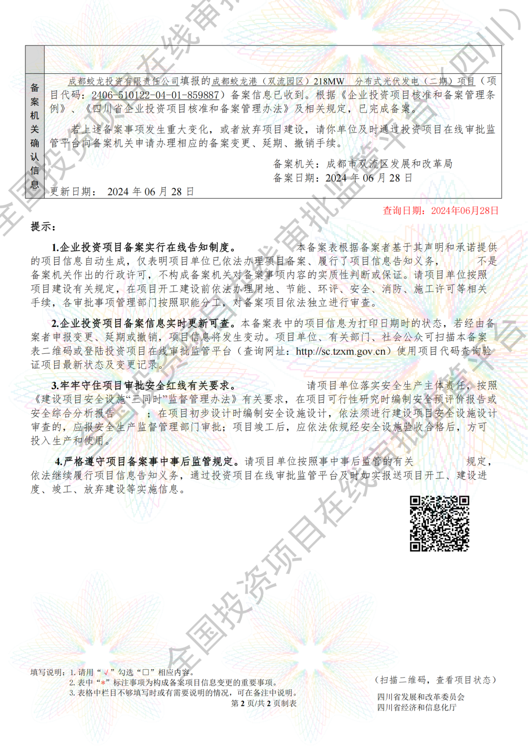 成都蛟龙港作为全国首家民营港城园区,肩负着10多万居民的生活用电及园区4830多家企业生产用电供应的重担,为探寻园区可持续发展之路、积极响应国家3060双碳战略目标,实践清洁能源的生产运用,成都蛟龙港以低碳园区为核心,高效利用其工业园区约150万㎡的可利用厂房屋顶,大力建设分布式光伏电站,构建产业生态圈,加快建设产业活力强劲、服务功能完备的绿色生态园区,以推动绿色能源的应用与发展,打造低碳或零碳园区,项目装机容量为318MW光伏发电项目+200MW储能项目,该项目一期建设100MW,目前已完成并网发电35MW,剩余65MW,预计2024年内建设完成,建成后预计年发电量8000万度。二期建设218MW,预计2025年全部建成并网发电,届时本项目年均发电量约2.6亿度。