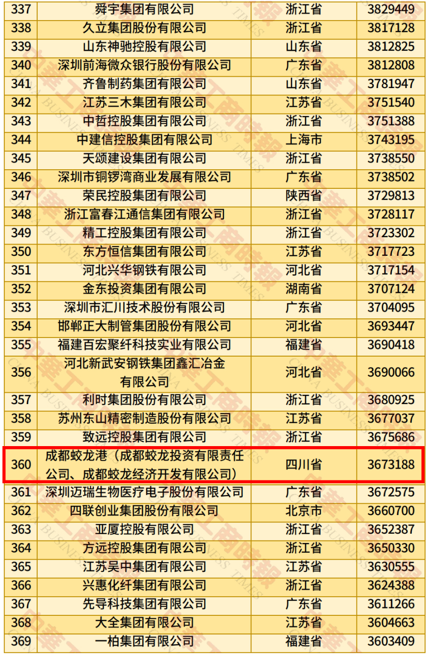 2025年8月28日,由全国工商联、辽宁省人民政府共同举办以“携手优强同发展 决战决胜促振兴”为主题的2025中国民营企业500强发布会暨全国优强民企助力辽宁全面振兴新突破大会在辽宁沈阳举行。会上重磅发布了“2025中国民营企业500强”“2025中国制造业民营企业500强”和“2025中国服务业民营企业100强”榜单。今年民营企业500强入围门槛达270.23亿元。四川有通威集团、新希望六和、成都蛟龙港等11家民营企业上榜中国民营企业500强。成都蛟龙港已连续13年荣登中国民营企业500强,今年位居360位。