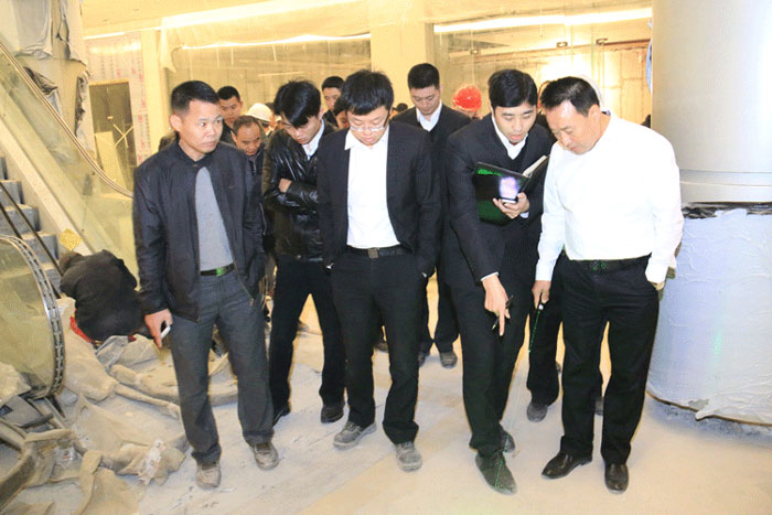 1月17日,香港蛟龙集团CEO、成都蛟龙港管委会主任黄玉蛟及海滨装修指挥部相关负责人在海滨城购物中心装修现场召开会议。现场会上,黄玉蛟详细检查了地砖铺设、电梯安装、吊顶、地面清洁卫生等施工进展情况。黄玉蛟指出,地砖与地砖之间的缝隙要采用实心钢条填充,以免时间一久,薄薄的钢条很快就被熙熙攘攘的人流磨穿,黄玉蛟强调,既然要做,就得使用性价比较高的产品,不仅要美观大方,还要打造出让消费者感到宾至如归的效果。他还指出,海滨城内场装修已到收尾阶段,相关负责人应当积极督促清洁工人开始做好地面清洁工作,让进来参观的人感到整洁舒适。黄玉蛟要求,项目相关负责人应当时刻保持工作热度,加班加点进行最后装修冲刺,团结一致,勇往直前,共筑海滨城辉煌明天。