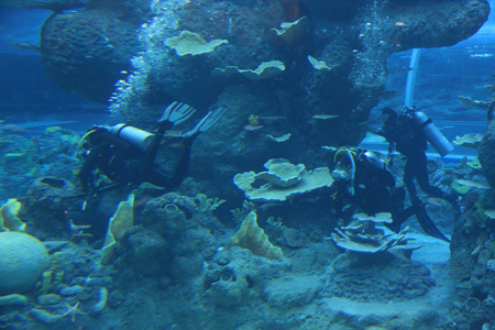 潜水爱好者们跃入浩海立方湛蓝的海水中热身,他们犹如鱼儿一般自由穿梭其间,沉醉于海洋给予他们的乐趣,潜游中,他们还时不时停下来与在外观看的游客打招呼,气氛显得格外融洽。