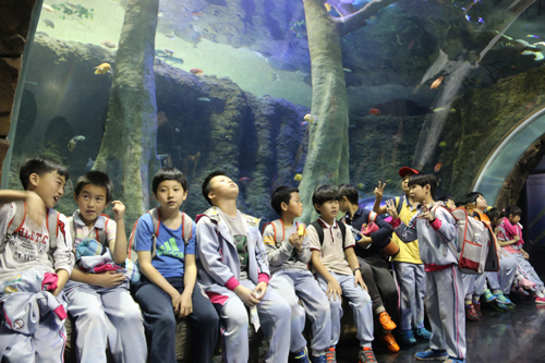 在随行老师的引导下,孩子们依次排队走进海滨城购物中心,当到达“浩海立方”海洋世界主体大海槽时,孩子们被眼前的景象深深震撼,流露出惊讶的表情,许多孩子连连感叹好漂亮、好壮观。在海底隧道,成群结队的鱼儿欢快的从孩子们头顶上游过,孩子们纷纷拿出相机留影,生怕错过这些美丽的海洋生物。在五楼特色展区海洋公园内,孩子们看到憨态可掬的企鹅们在水里游泳、徜徉时,个个欢呼雀跃,激动万分。