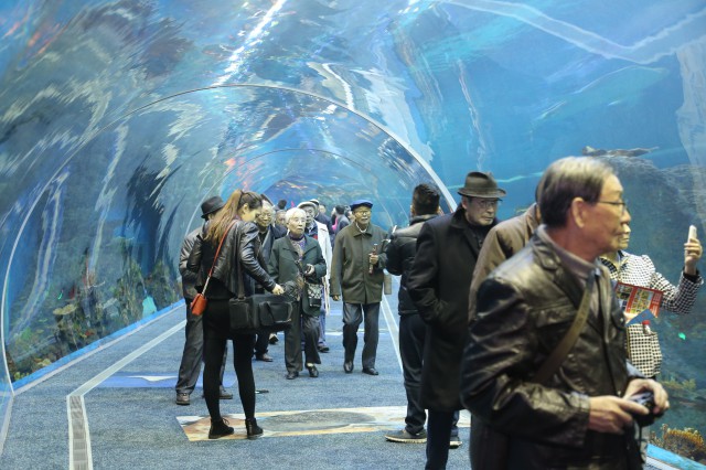 在创两项世界吉尼斯纪录的海洋观景窗前,离退休老干部们纷纷驻足观看。大海槽里的奇特海洋生物,让老干部们激动万分。老干部们拿出手机拍照留念,纪录下这神奇而壮观的景象。随后,老干部们依次游览了海底隧道、中国馆、热带海洋区、企鹅馆等各聚特色的场馆。在参观过程中,海洋馆的工作人员详细为老干部们介绍各种海洋生物,老干部们称赞浩海立方海洋馆是一个开眼界的地方。