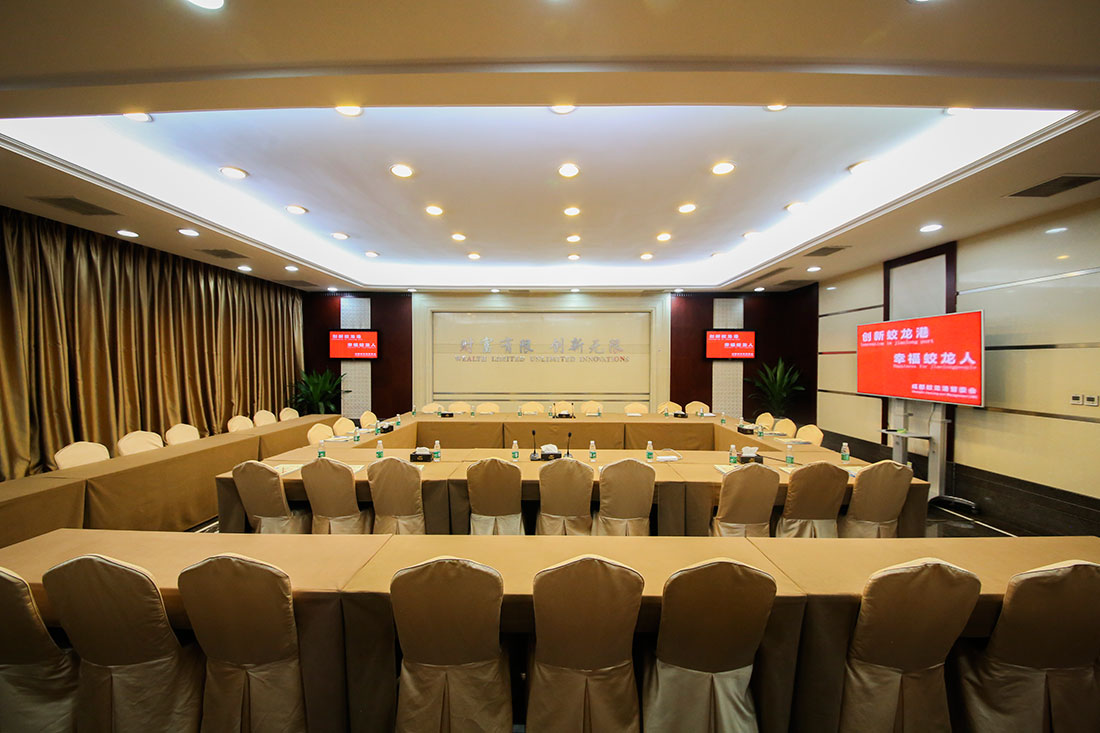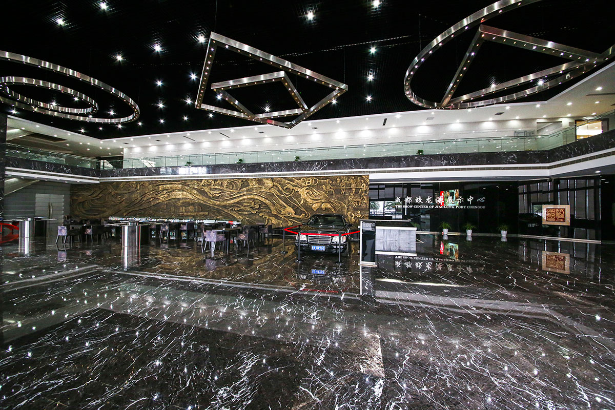 蛟龙港展示中心是成都蛟龙港对外全方位展示的一个平台,更官方的、系统的、多元化的为参观者提供园区的详细资料;通过高新科技手法和深度文化内涵,从多角度向人们展示蛟龙港为推进城乡一体化发展,从起步、发展到未来,展示蛟龙的创新和超前的精神文化底蕴,展示蛟龙人推进城乡一体化发展取得的显著成果,传播解决'三农'的“蛟龙模式”取得的成功经验,将为考察学习“蛟龙模式”的各界人士起到举足轻重的作用。整个展示中心投资约6000多万元,建筑面积约6000平方米,采用全彩钢框架结构建设,建筑设计为三层,一层主要是以蛟龙沙盘、蛟龙展示厅以及休息体验区为主;二层主要以行政办公和会议接待为主。