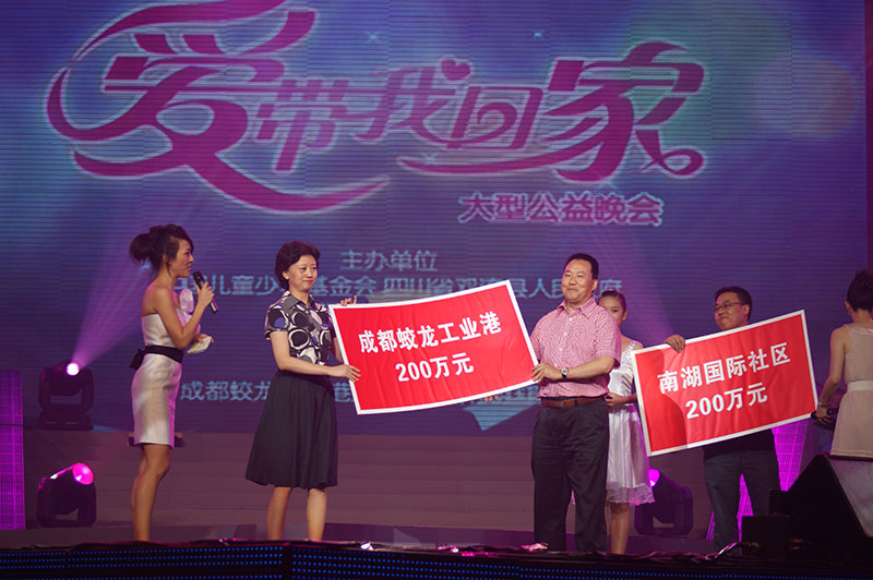 2009.8.26,在“爱带我回家”大型公益晚会上,成都蛟龙港捐款200万元