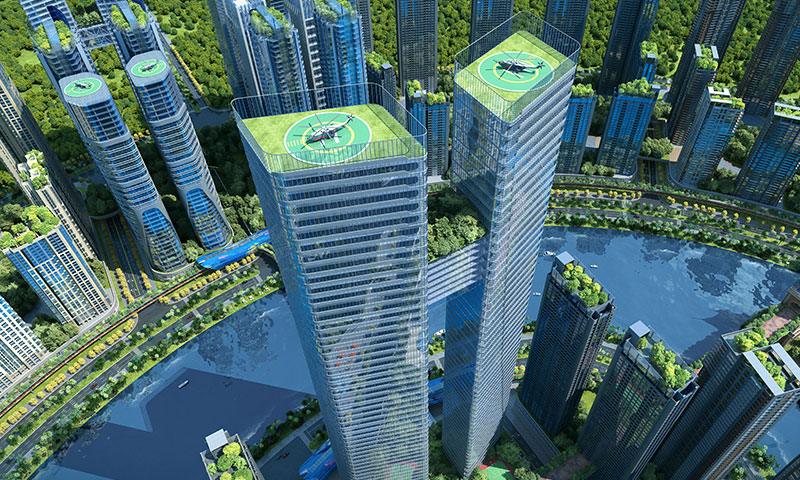体现最大的集中节约用地模式,房顶上将全面打造森林及生态式办公区域,汽车直接将生产物资运至工厂每个楼层,做到废气、粉尘、噪音集中处理,废水进入雨污分流管网到污水处理厂进行集中处理,达到0排放、0污染,如果天气炎热、空气质量不达标,可通过智能降雨使这个区域变成环境优美的地方。